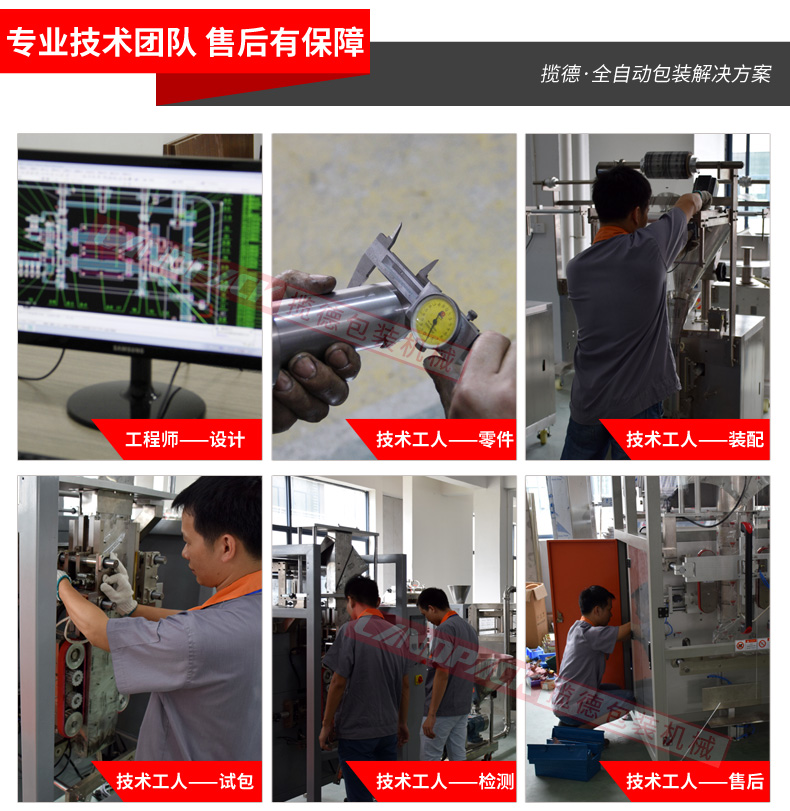 攬德包裝機廠家擁有十幾年從事包裝機行業(yè)經驗的開發(fā)團隊,從客戶下單以后,交由工程師進行機械圖紙的設計,接著技術工人進行零配件的生產加工,各方面的零配件加工好以后,進行裝配環(huán)節(jié),整機安裝完成后,交由技術人員進行試包、檢測排除故障。一個完整的流程下來,保證了產品的質量。