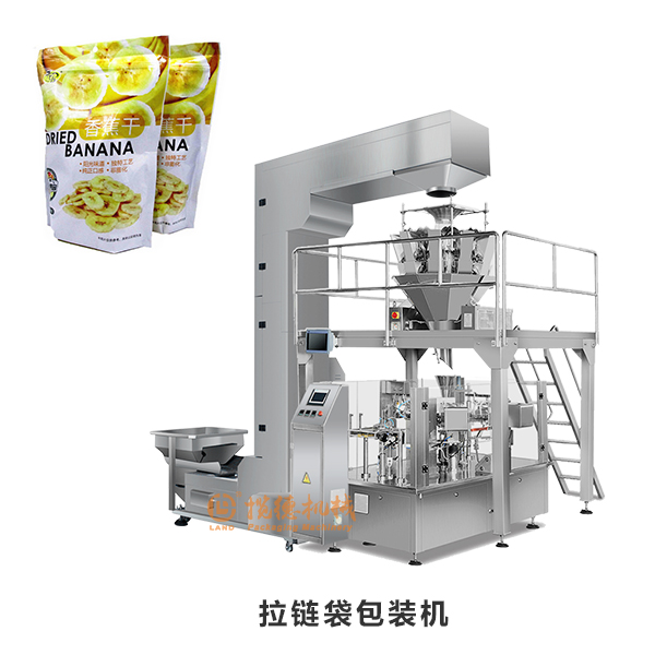 脫水果蔬包裝機是我司針對市場上一些香蕉干、蘋果片、香蕉片、脆片等類型的油炸食品而研發(fā)的一款自動稱重包裝機,該機由立式包裝機主機、10頭電子組合稱、Z型物料提升機、工作支撐平臺、成品輸送機、氮氣機組合而成。這臺機器的工作流程是:工作人員把需要包裝的蘋果片、香蕉片等物料倒入震動儲料斗當中,通過Z型上料機,把香蕉干輸送到10頭電子稱當中進行自動稱重,然后經過下料、填充、充氮氣、封口,成品輸出等一系列環(huán)節(jié)全自動完成包裝過程。